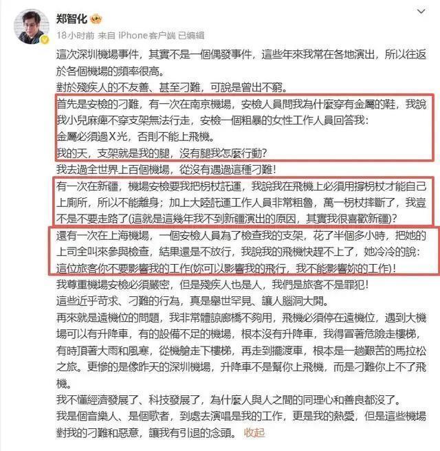 他说深圳机场一点也不照顾他作为残疾人的需求,不仅没有设置残疾人专属的无障碍通道, 而且机场工作人员和机长也一点不顾及他残疾人的感受,求助也置之不理。 最终他只好“连滚带爬”的登上了飞机。 事情闹大之后,舆论哗然,很多人都非常同情郑智化。